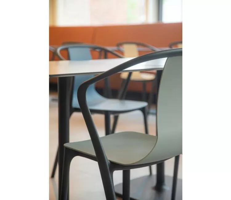 L'espace est accessible 24 heures sur 24. Il faut donc du mobilier solide et facile d’entretien, capable de supporter un usage intensif. Studio M a opté, via Moments Furniture, pour la chaise Belleville de Vitra, le banc mural Jazz et la table Rhino.